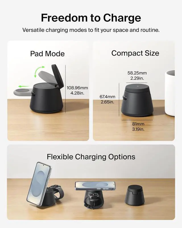 COMPACT, CONVERTIBLE, PROTECTIVE: Adjustable and ultra-compact, it travels easily and converts from stand to pad mode. A collapsible watch holder folds away after use, while a non-slip base and soft-touch silicone protect your phone during charging.