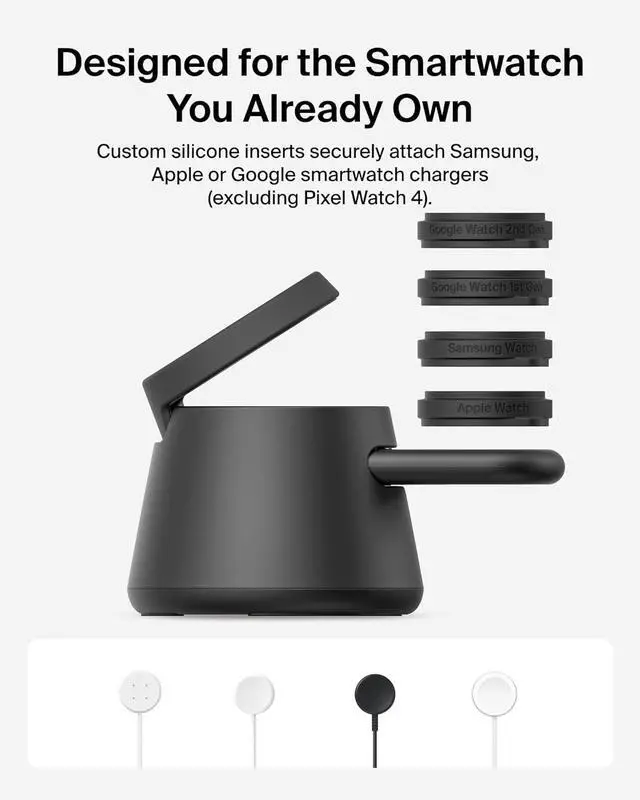 DESIGNED FOR YOUR SMARTWATCH: Comes with custom silicone inserts made for original Android and Apple smartwatch chargers (excluding Pixel Watch 4), including inserts for Apple Watch, Google Watch (1st and 2nd Gen), and Samsung Galaxy Watch.