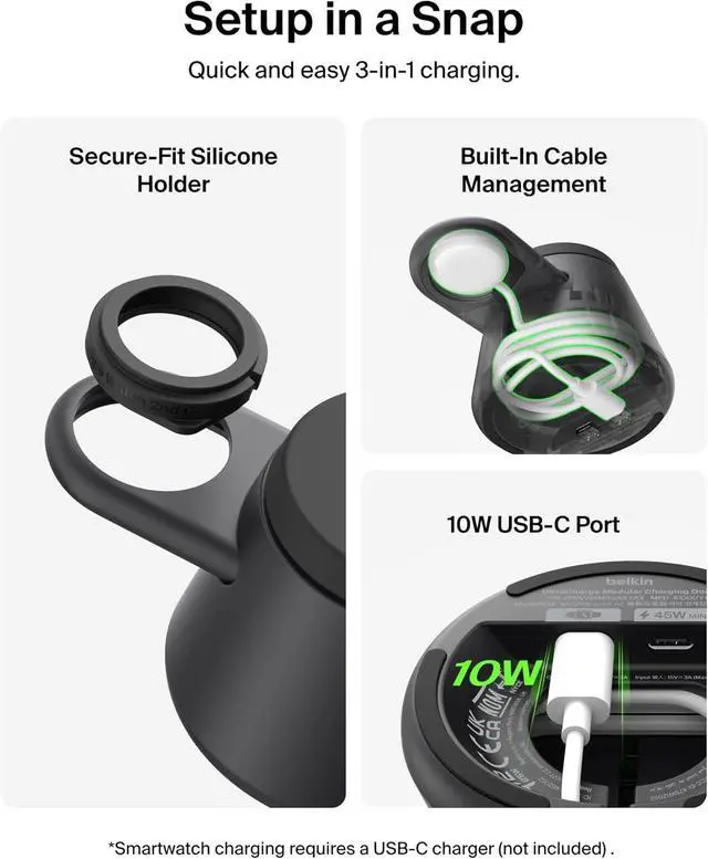45W PSU CONNECTED: This Belkin UltraCharge 3-in-1 Charger includes a 45W power supply and 5ft USB C cable so you can start charging right out of the box. Smartwatch charger is not included and must be added separately.