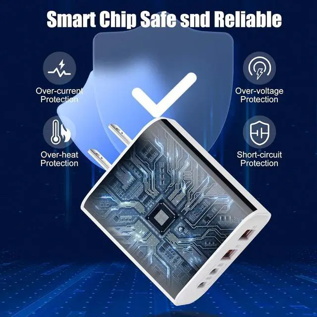 Safety & Reliability Multiport ChargerMultiport Charger Certified RoHS,CE & FCC,Protect Devices from Over-Heated and Over-Currents,Over-Charging,and Short Circuits,Charging Will be Automatically Stopped When the Battery is Full.The 4 Port Fast Charger Block Featured With ABS + PC Fireproof Material,You Can Make Sure Your Digital Devices are Always Safe Charge.