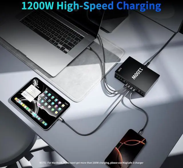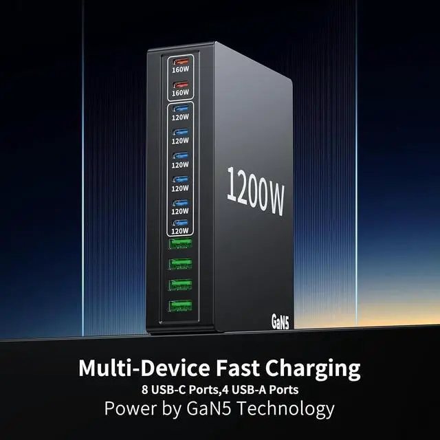 Fast-Charging Station It with total 1200 watt power. 12 port . 8 USB C port and 4 USB A .160W x 2 USB C and 6x120W USB-C Power Delivery Compatible with Smartphone, Tablet, and Laptop, Work For MacBook NEO MacBook Pro MacBook Air iPhone 17 16 15 Pro max 14/14PLUS/14PRO/14PRO MAX 13/ 13 Mini/ 13 Pro/ 13 Pro Max iPhone 12/ 12 Mini/ 12 Pro/ 12 Pro Max/ Samsung Galaxy S21+/ S21/ S21 Ultra/ S21 FE/ S20+/ S20/Dell XPS 15/ 13 Google Pixel iPad Pro 12.9''/ iPad Pro 10.5''/ iPad Pro 11''/ iPad Mini Series/ iPad Air Series AirPods Pro.more up to 3× faster than with an original old charger. 4 X20W USB A fast charger port for your other devices