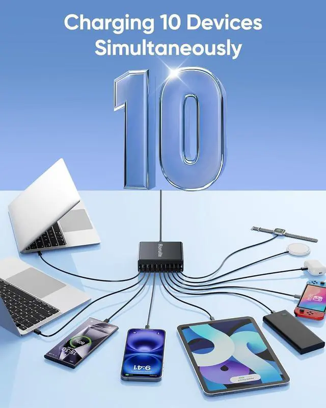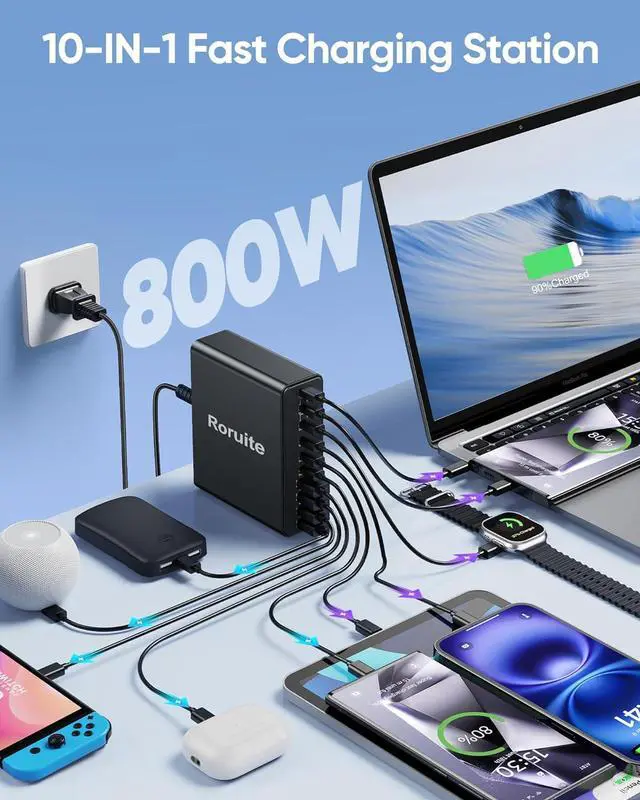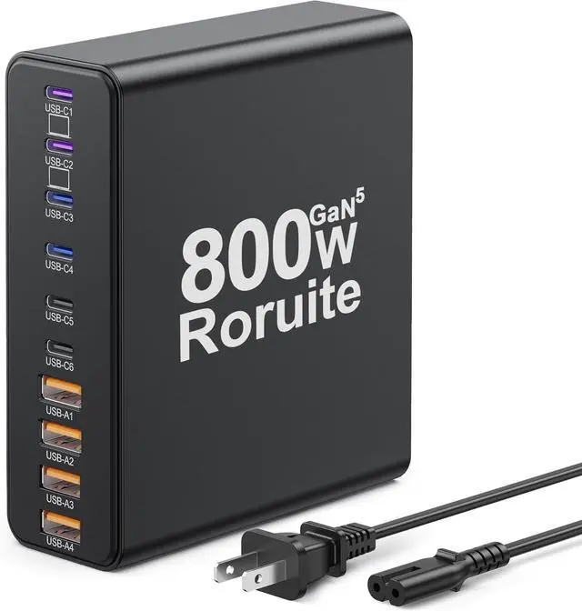 800W Multiport USB C & A Charging Station This 10-port USB-C charger block from Roruite is the ultimate charging solution for multiple devices. Equipped with 6 USB-C charging ports and 4 USB-A charging ports, it features intelligent power distribution that quickly formulates the shortest charging plan for youpowering up all your devices at the fastest possible speed with no waiting time. Notably, our 120W super fast charger is 3x faster than a regular 65W charger.