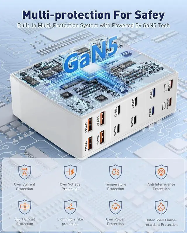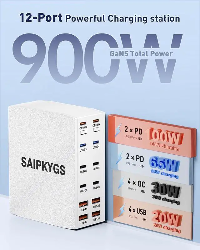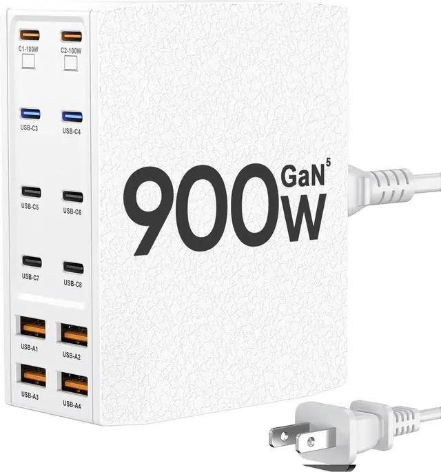12-in-1 USB C Charging StationThis 900W USB C Charger Block comes with 8 USB C ports and 4 USB A ports to charge multiple devices, simplify your charging setup, and let you experience the convenience of ultra-fast and ultra-high output charging. With its smart charging technology, it can automatically detect and provide the best power output for each connected device, ensuring fast and efficient charging.