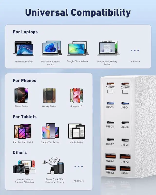 Universal CompatibilityOur USB C charging station is equipped with 2*100W and 2*65W fast charging ports, which can charge 3 or more laptops at the same time. Compatible with smartphones, tablets and laptops, suitable for MacBook Pro/Air, Dell XPS, iPad Pro, Phone 17/16 Pro Max,16/16 Pro Max, Phone 15 Pro Max, Phone 14/13 Pro/12 Pro Max, iWatch, AirPods, Surface Pro, Galaxy S24 Ultra, Switch, Steam Deck, Google Pixel and many other devices.