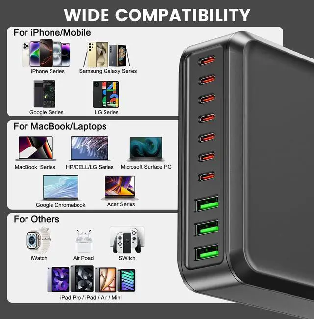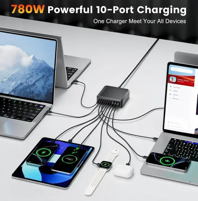 10-in-1 780W Super Fast Charging StationIt with total 780 watts, 10 USB ports (7 USB-C+3 USB-A) , can power up to 10 devices simultaneously. 780W Power Delivery Compatible with Smartphone, Tablet, and Laptop, Work For MacBook Pro 16''/MacBook Pro MacBook Air MacBook iPhone 16 15 Pro max 14/14PLUS/14PRO/14PRO MAX 13/13 Mini/13 Pro/13 Pro Max iPhone 12/12 Mini/12 Pro/12 Pro Max/Galaxy S21+/S21/S21 Ultra/S21 FE/S20+/S20/Dell XPS 15/13 Google Pixel iPad Pro 12.9''/ iPad Pro 10.5''/ iPad Pro 11''/ iPad Mini Series/ iPad Air Series AirPods Pro. One 10 ports versatile usb charging solution provides multi charging options to meet all charging needs of your families, ideal for the home, office.
