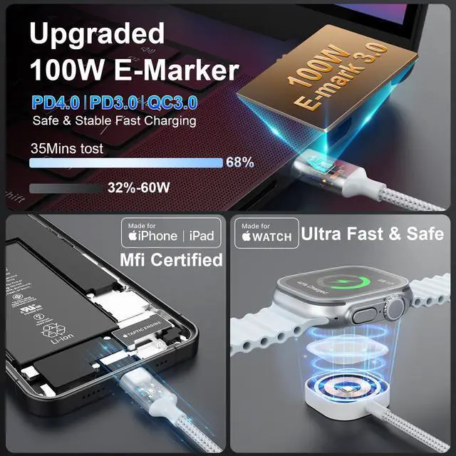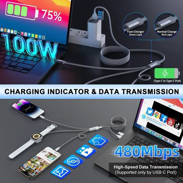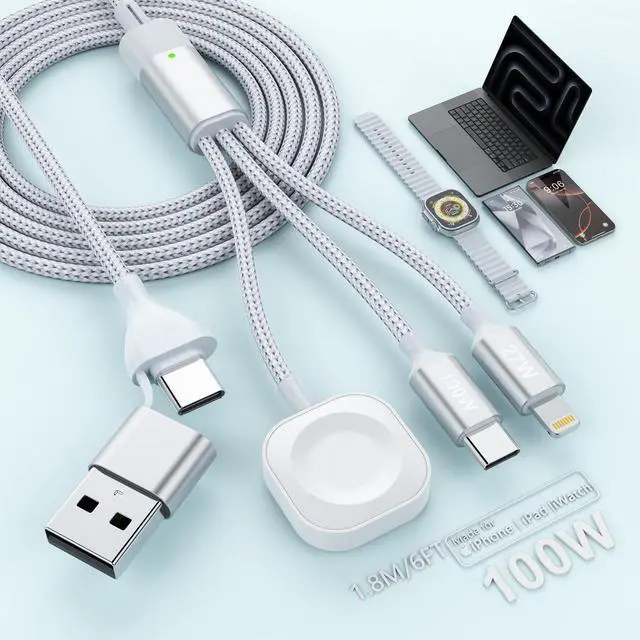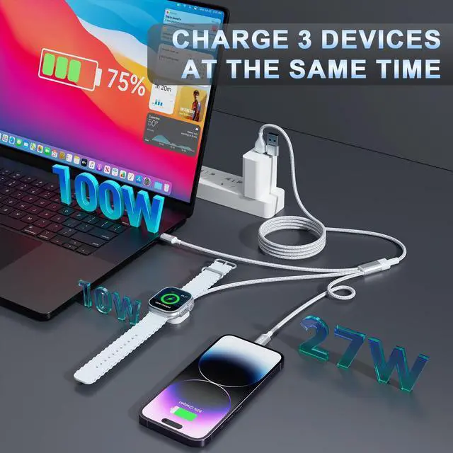 100W USB C iWatch Charger, 3 in 2 USB C+A Multi Fast Charging Cable for Apple Watch & iPhone, 6FT Wireless Travel Magnetic Charging Cable for iPhone 16/15/14/13/12, iWatch Ultra/SE/9/8/7/6/5, Galaxy