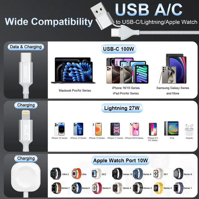 | Compatible Phone Models | The 3 in 2 multi charging cord with Lighting/watch/Type C port, iwatch charger cable is compatible with iWatch 10/9/SE/8/7/6/5/4/3/2/1 magnetic watch charger (Compatible with all 38mm ,40mm ,42mm and 44mm watches); Multi charger is compatible with iphone 14/13/12/11/X/Xs/Xr/8; and one is USB C multi charger cable compatible with iPhone 16 series/iPhone 15 series/Samsung Galaxy S23/S23+/S23 Ultra/S22/S21/S20/ S20+/etc. devices. |