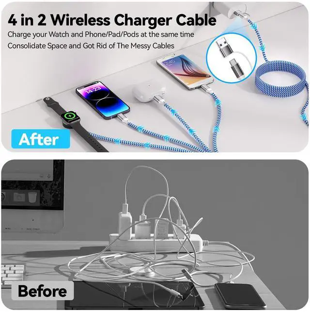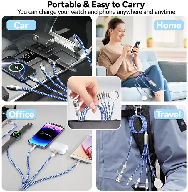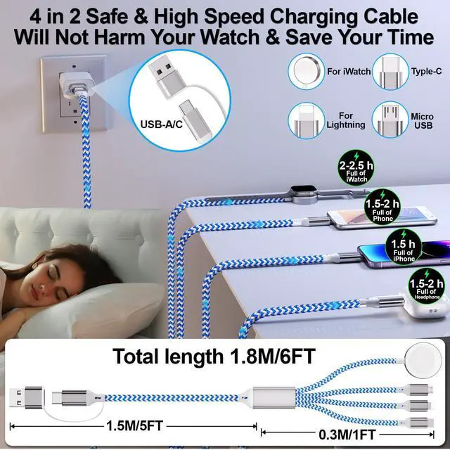 6FT/1.8M iWatch Charger, 4 in 2 USB A/C to iOS Port/Type C/Micro USB/Watch Charger Nylon-Braided Multi Fast Charging Cable Compatible for iWatch Ultra/SE/1-11/iPhone/iPad/AirPods/Galaxy/Huawei. Compatible with all Series iWatch Ultra 3/Ultra 2/Ultra/SE 3/SE 2/SE/11/10/9/8/7/6/5/4/3/2/1 and iPhone Air/iPhone 17/16/15/iPhone 17 Pro /iPhone 17 Pro Max/15 Pro/15 Plus/15 Pro Max/14/13/12/12Pro/11Pro/XR/XS/XSMax/X/8/8Plus/7/7Plus/6/6Plus/5/5SE/5S/iPad4/iPadAir2/iPadAir/iPad mini/mini2/mini3/mini4 and AirPods.Samsung Galaxy S25/S25+/S25 Ultra/S24/S23/ S23 Ultra/ S22/S21/S20 (Note: Don't support data transfer & Not for Samsung Watch)