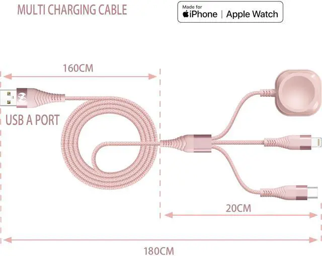• Universal 3-in-1 Multi Charging Cable for iPhone, iWatch & Type-C Devices.Simplify charging with 3 in 1 charging cableApple Watch charging cable, iPhone charging cable, and Type C charging cable in one sleek design. Perfect for charging multiple devices at once, travel essential for busy lifestyles. Nylon braided body and aluminum shells ensure durability, while USB to lightning cable and USB C to A cable connectors make it compatible with iPhone charger cord, iWatch charger, and USB C cables