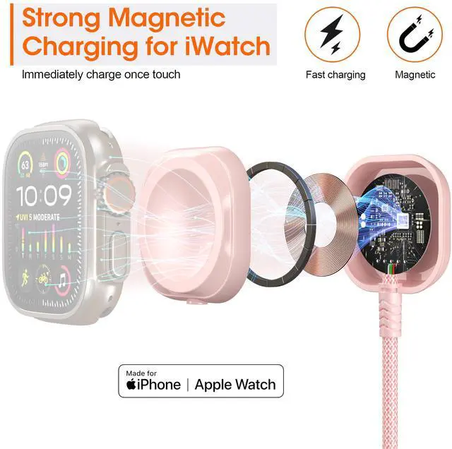 • Magnetic iWatch Charging with Fast, Secure Connection.Keep your Apple Watch charger fast charging with strong magnetic adsorption. This iWatch charging cable snaps securely to your device for steady power, even on the go. Paired with iPhone charging cord and Type C charger cable ports, its ideal for travel charger for multiple devices. Note: Remove bulky cases for optimal speed