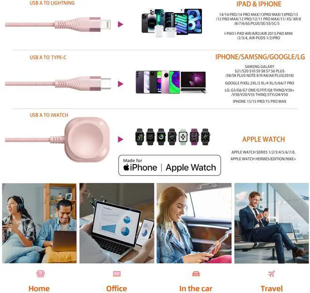 • Compact Travel Charger for On-the-Go Power.Stay powered anywhere with this 3 in 1 charger. Its portable design fits seamlessly into travel essentials like bags and suitcases. Charge iPhone, iWatch, and USB A to C cable-compatible devices simultaneouslyno adapters needed. The multi charging cables nylon braided durability resists wear, making it a reliable charger cable for adventures or daily commutes