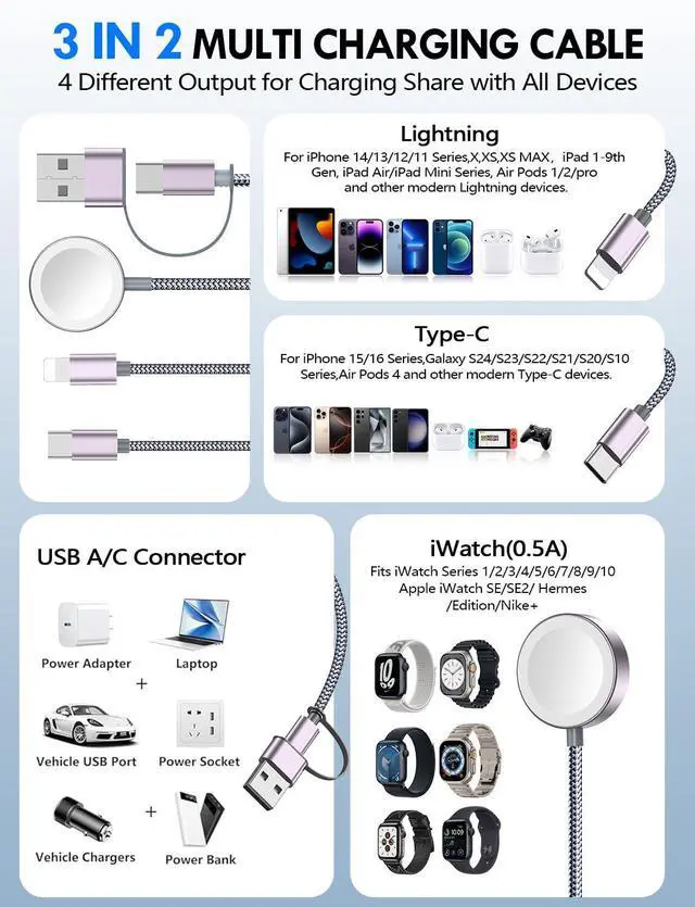 ![Main image of 2Pack Multi Charging Cable Cord for Travel Essentials,Apple Watch Charger,iPhone Charger,[3-in-2] Type C/Lightning Cable Portable Designed for iWatch,iPhone 17-8,Galaxy S25-21,Xbox Series X&S,iPad-4FT](https://c1.neweggimages.com/productimage/nb640/C3H4D25120802HBIQ47.jpg)