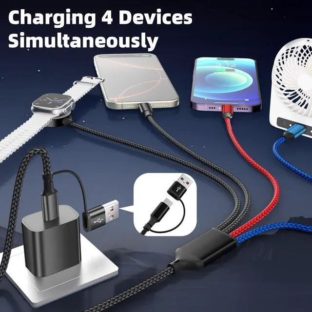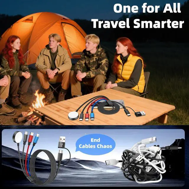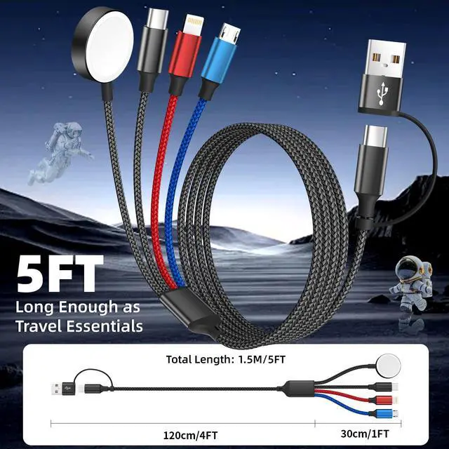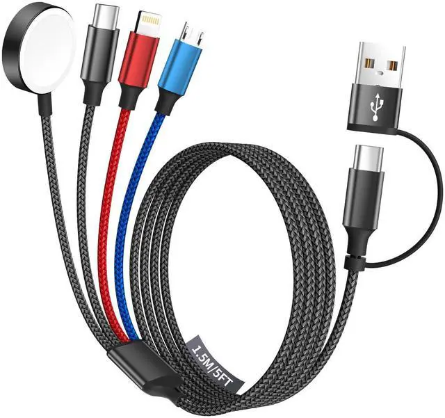 Your Ultimate 5FT 4-in-2 USB C Cable for Apple Watch Charger(1 Pack) Stop Your iPhone Cables Chaos! Simplify Charging Everywhere You Go. The innovative travel essential designed to declutter your life and power all your devices effortlessly. Spotting one usb-c port, a lightning cord, micro usb cable, and even one for your Apple Watch, this multiple iphone charger cord covers all the base options you need to keep things charged. Ditch the tangled mess of multiple charging cords and experience the ultimate convenience of multi charging cable technology. Travel Vacation Essentials & Car Accessories One Cable, featuring dual-headed adapter (USB-A + USB-C), has two options for the wall block - No more hunting for the right cable end. Perfect for the latest iPhones 17/16/15, Sam-sung Galaxy S23/S24 and more. The Travel/Camping Essentials & Car Accessories & Airplane Travel Accessories & Europe Vacation Essentials: Compact, lightweight, and tangle-resistant, power your phone, iwatch, and earbuds using just ONE cable and ONE power source! Safe, Smart & Durable: This 4-in-2 watch charger cord ensures safe, optimized charging for each connected device. And the premium materials makes this watch and phone charger cable last for long. Universal Compatibility: Power Virtually Everything! Output Versatility: USB-C: Charge any USB-C device (iPhone 16/15 Series, iPad Pro/Air, Mac-Book Air/Pro, Galaxy S23/S24/25/Ultra, controllers, earbuds, power banks, etc.). iWatch Charger: Compatible with Apple Watches (Series 1, 2, 3, 4, 5, 6, 7, 8, 9, Ultra, Ultra 2, SE). Micro USB Port: For mirco USB devices Lightning Port: For 14/13/12 and more (this port also support data sync ups to 480 Mbps) Simplify Your Life Today and no more need carrying multiple chargers!