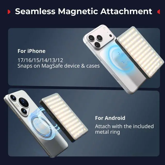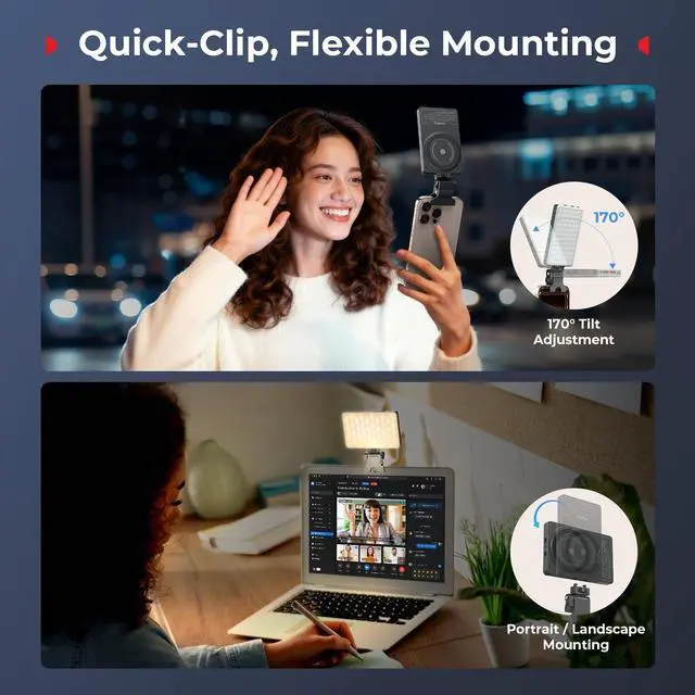 SmallRig M3 Attachable Mobile Phone LED Video Light (Ink Blue) 5505 offers versatile mounting solutions with magnetic compatibility for instant attachment and detachment. It works seamlessly with magnetic-enabled for iPhones or pairs effortlessly with Android devices using the included metal ring achieving secure mounting in just one second! Additionally, it features a clip-on quick release base that enables horizontal or vertical mounting on monitors or laptops within seconds, complete with 170° tilt adjustment for perfect positioning ensuring tool-free installation and hassle-free lighting setup.