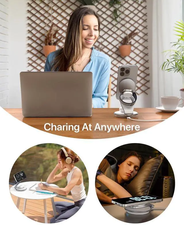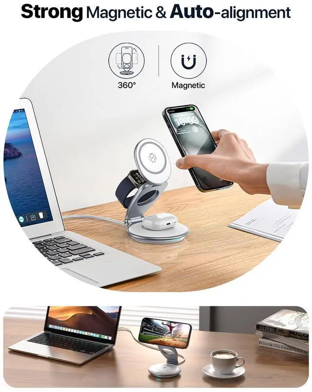 Our latest W37 wireless charging station is designed to meet all your charging needs with its 3-in-1 solution for your iPhone, Apple Watch, and AirPods. The magnetic charging feature ensures a secure and stable connection, while the folding design makes it incredibly portable. We've included a convenient carrying case to make travel even easier. Most notably, our unique 360° rotating base sets the W37 apart, allowing you to share the charging station with others effortlessly.