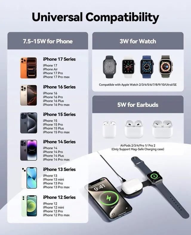 | Compatible Phone Models | iPhone 17 / 17 Air / 17 Pro / 17 Pro Max / iPhone 16 / 16 Plus / 16 Pro / 16 Pro Max / iPhone 15 / 15 Plus / 15 Pro / 15 Pro Max / iPhone 14 / 14 Plus / 14 Pro / 14 Pro Max / iPhone 13 / 13 mini / 13 Pro / 13 Pro Max / iPhone 12 / 12 mini / 12 Pro / 12 Pro Max, AirPods 4 3 2 1 Pro 1 2 3 (With Wireless Charging Case) And More, Apple Watch 11/10/9/8/7/6/5/4/3/2/1 |