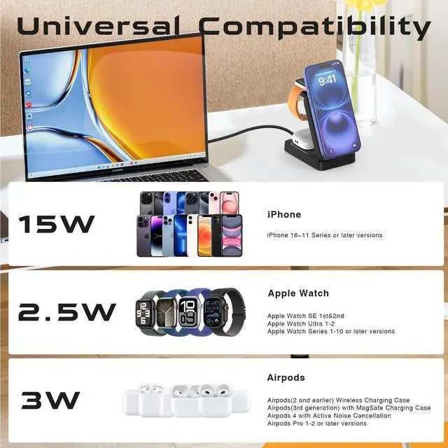 | Compatible Devices | [iPhone Series]iPhone 16e, iPhone 16 Pro Max, iPhone 16 Pro, iPhone 16, iPhone 16 plus,iPhone 15 Pro Max, iPhone 15 Pro, iPhone 15, iPhone 15 plus,iPhone 14 Pro Max, iPhone 14 Pro, iPhone 14, iPhone 14 plus, IPhone 13, iPhone 13 Pro, iPhone 13 Pro Max, iPhone 13 Pro Mini, iPhone iPhone 12 Pro, iPhone 12 Pro Max, iPhone 12, iPhone 12 mini, iPhone 11 Pro, iPhone 11 Pro Max, iPhone 11, iPhone SE (2nd generation), iPhone XS, iPhone XS Max, iPhone XR, iPhone X, iPhone 8, iPhone 8 Plus;[Airpods Series]Airpods 4,Airpods 3,AirPods Pro 2, AirPods Pro, AirPods (3rd generation), AirPods 2 Wireless Charging Case;[iWatch Series] iWatch 10/9/8/7/6/5/4/3/2/1 |