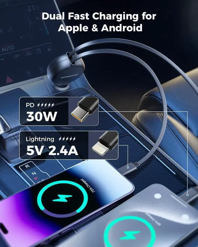 | Special Feature | 50% Smaller & Lighter retractable car charger size; Retractable Type-C & L Cords, 2x2.6ft; Keeping Your Car Well Organized; 2 IN 1 Super Fast Car Charger Adapter; 42W Fast Charging; All-Round Protections; For Both 12V DC and 24V DC. |