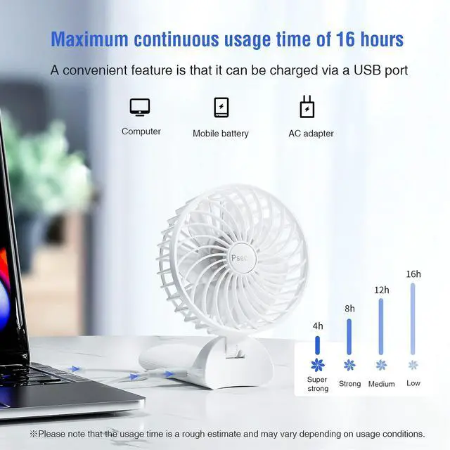 - Ultra-Quiet 20dBAt the weak mode, the operating noise is as low as 20 decibels, providing powerful cool air during study or work. Although the built-in battery capacity is not large, it has a comparable operating time to large-capacity fans on the market. The weak mode allows for up to 16 hours of continuous operation, and it only takes 3-4 hours to fully charge, making it an energy-saving handy fan.
