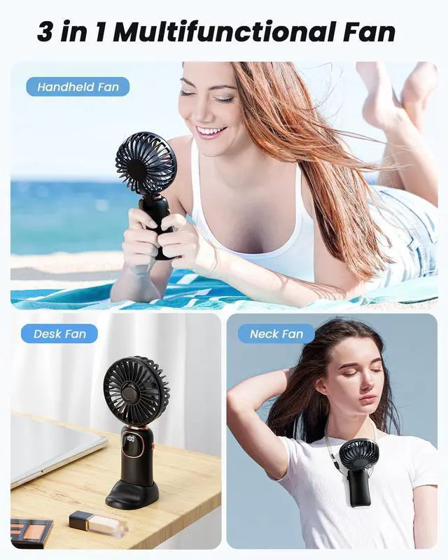 4.3-in-1 multifunctional fan that can be used as a handheld fan, neck fan, or desk fan.
