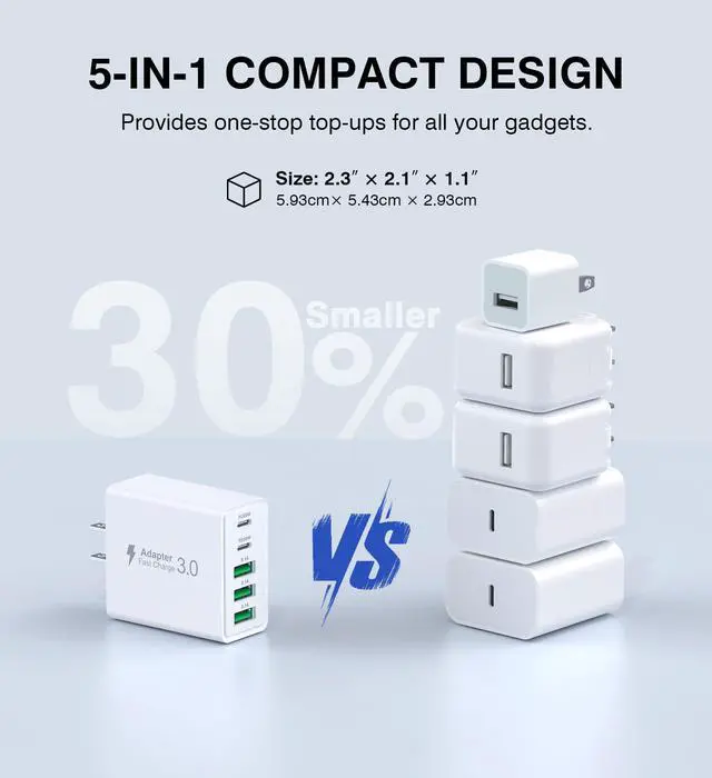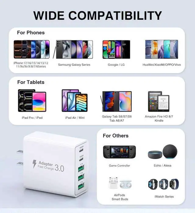 ![Main image of [2-Pack] USB C Wall Charger,60W 5-Port PD Fast USB C Charging Block,2USB C+3USB A Multiport Plug,Type C Power Adapter Brick Cube for iPhone 17/16/15/14/13/12/Pro Max/XS,iPad,for Switch,Samsung,Ultra 2](https://c1.neweggimages.com/productimage/nb640/C5JMD2603050B8LZHCC.jpg)