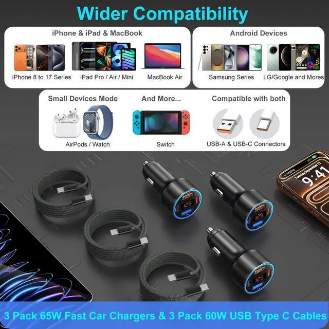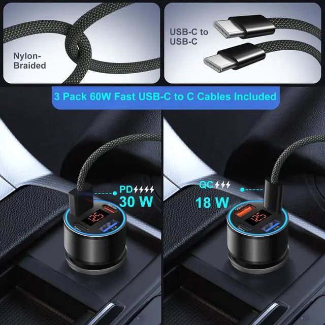 Each car adapter will light up with a soft blue ring light, makes it easier for you to locate the charging port when its in dark.