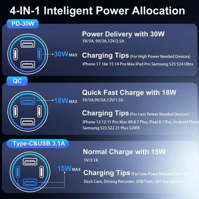 With independent smart chips and multi protection system, the usb car power adapter can fast charge up to 4 devices simultaneously.