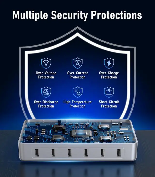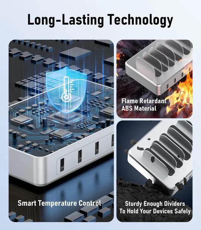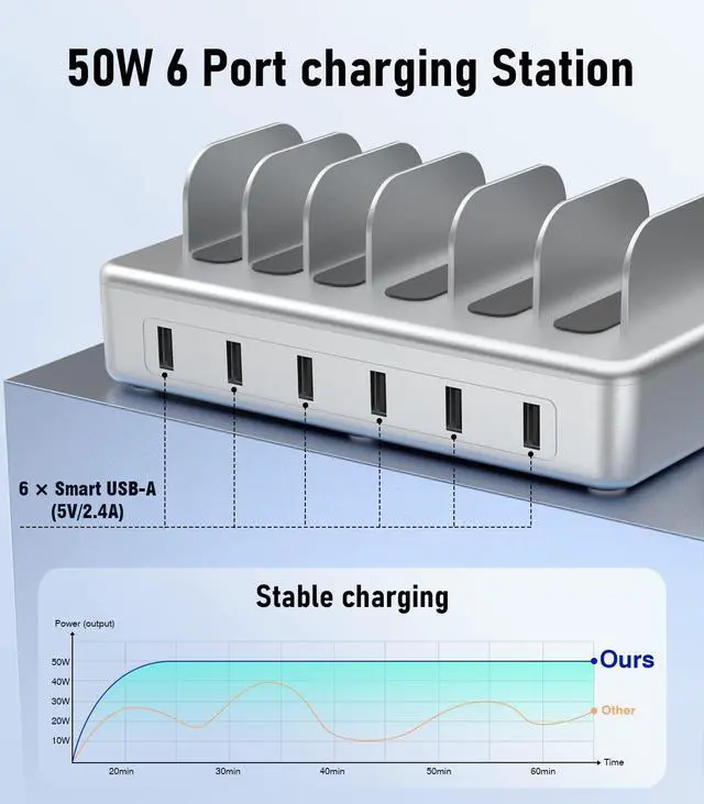 Special DesignThe usb charging station is in a premium silver colour. The nightstand charging station is designed with two width slots, three are 0.75 inches and the remaining three are 1 inch. The slots of different widths can accommodate different-sized equipment.It's sturdy, and not easy to collapse