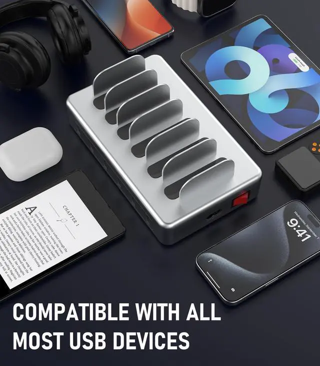 Multi-Device CompatibilityThe iphone charging station comes with 6 short cables and a Type-A to Type-C Adapter Converter, which is compatible with most usb devices for charging. CREATIVE DESIGN charger station keeps your devices nicely organized in a row, and there are no more adapters and tangled cords everywhere