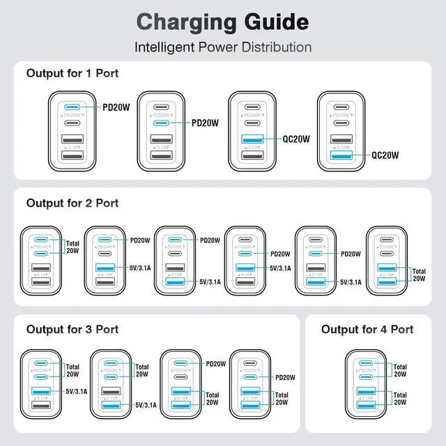 | Specification | Input: 100-240V, 50-60Hz 0.6A Output:20W 5V/3A, 9V/2.22A, 12V/1.66A Total 40W Max |