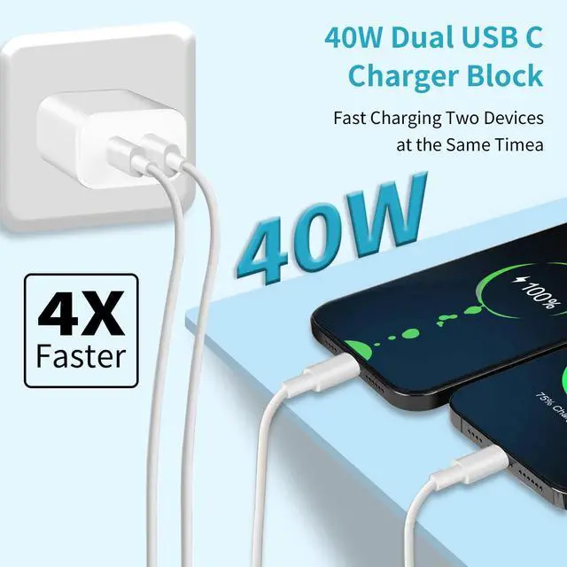 YEONPHOM 40W Fast Charger for iPhone 17 16 15 Pro Max Charger Fast Charging,2Pack Dual Port USB C Charging Block with 2Pack 6FT USB C to USBC Cord for iPhone 16 15 Plus/16 15 Pro Max/iPad Pro/Samsung S24 40W USB C Charger Block iPhone 17 16 15 charger fast charging cord with maximum power of 40 Watt output, the USB-C fast wall charger block is ingeniously designed with two distinct and independent output ports. This advanced feature empowers you to charge two of your cutting-edge USB-C devices, such as the iPhone 15/16 and the versatile iPad, simultaneously. Each port is capable of delivering an exceptional charging speed of up to an impressive 20W
