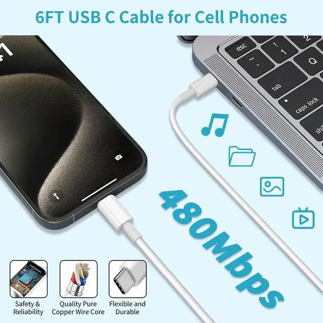 6FT Long USB C to USB C Cord iPhone 15 16 Charger fast charging comes with 6ft fast charging usb c cable. The 6ft USB-C charger cables are long enough for you to lie on the bed, sofa, in the car, or office anywhere you need them. USB C Charger Block comes with a 6ft USB C to C Cable that lets you can charge your C-port iPhone 15 16 serires,iPad directly, It has a friendly reversible design with a max 3A charging speed and 480Mb/s transfer speed helps you work efficiently. Gives you more fun and freedom in a fast charging period.