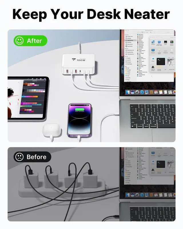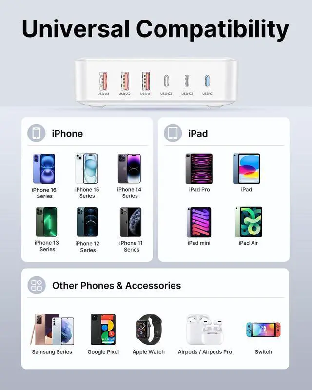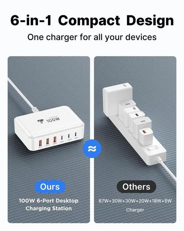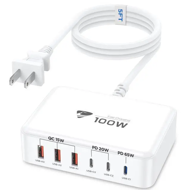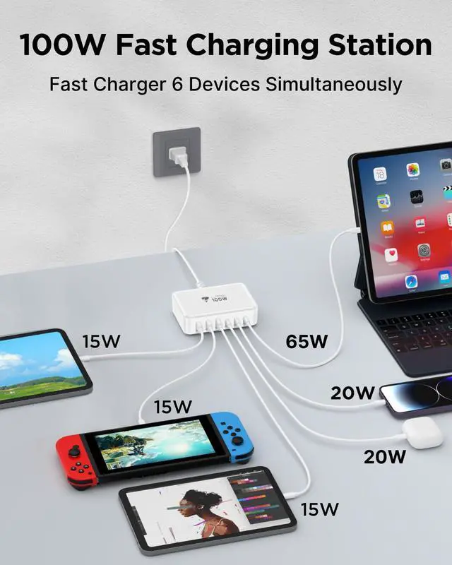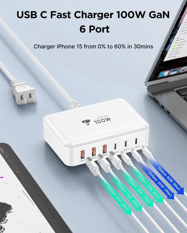The maximum power of the charger is 100W. The maximum output power for each interface can be referred to the instructions. If you use multiple interfaces for charging simultaneously, it will intelligently allocate different output powers among each interface.