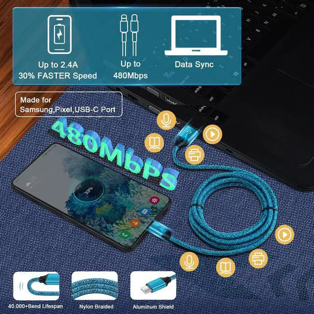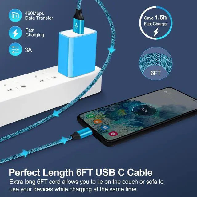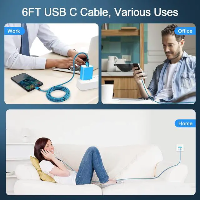 6FT long nylon braided data transfer cable usb to type c power cord, convenient for usage while charging and syncing at home, office, travel in bed, hotel rooms.