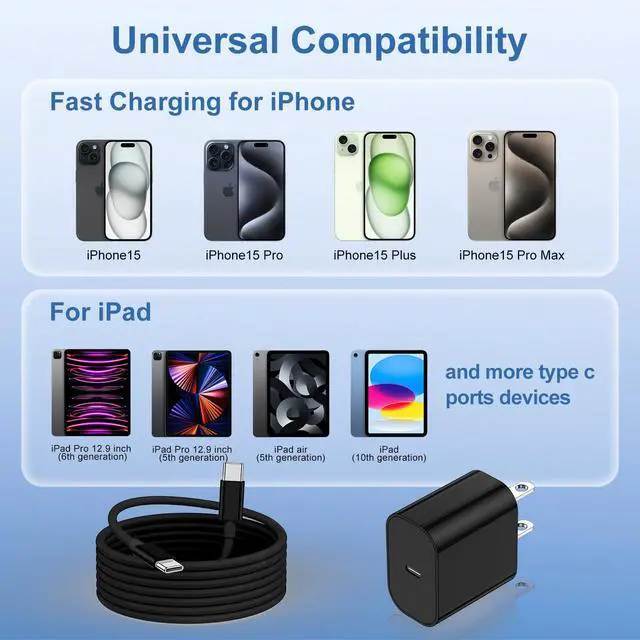 The 20W USB C charger and 60W C to C cable are suitable for C-type devices such as Apple iPhone 17/17 Air/17 Pro/17 Pro Max/16/16 Plus/16 Pro/16 Pro Max/15/15 Plus/15 Pro/15 Pro Max, iPad Pro 2022/2021/2020/2018 12.9/11/10.9 inch, 5/4/3/2/1st Generation, Air 5/4th, Mini 6 Gen, Google Pixel 7/7 Pro/6/6 Pro/5/4 XL/3a XL/3/XL/2, Galaxy S23/S22/S21/S20/S10, etc.
