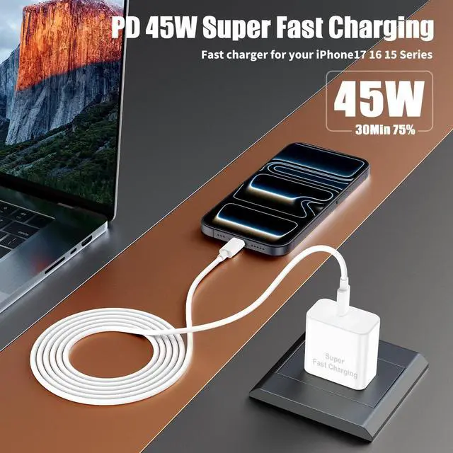 45W Super Fast for iPhone 17 16 chargerOur more powerful 45W USB C iPhone 17 16 charger using the PD 3.0 fast charging technology provides maximum 45 Watt output power, super fast charge for iPhone 17/16/15 series up to 75% in just 30 minutes, 45% faster than original 20W charger.