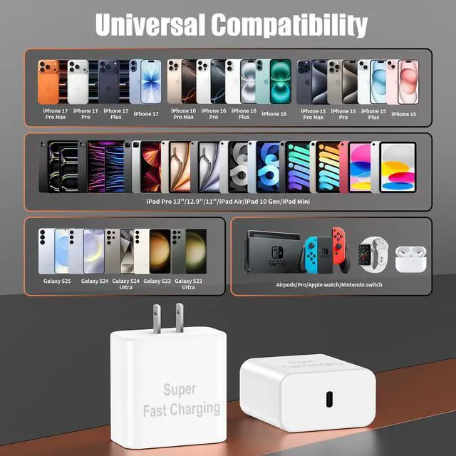Compatible with iPhone 17/iPhone 17air/17 pro/17 pro max/17 plus/iPhone 16 Pro Max/ iPhone 16 Pro/ IPhone 16/ IPhone 16e/ iPhone 16 Plus, iPhone 15/ iPhone 15 Plus/ iPhone 15 Pro/ iPhone 15 Pro Max, iPad Pro 11 inch 4th/ 3rd/ 2nd/ 1st, iPad Air 5/4th, iPad Mini 6th, iPad 10th Generation.and Galaxy S25/S24 Ultra/S24+/S24/S23 Ultra/ S23+/S23/S22 Ultra/ S22+/S22/S21 5G, and more USB-C Devices