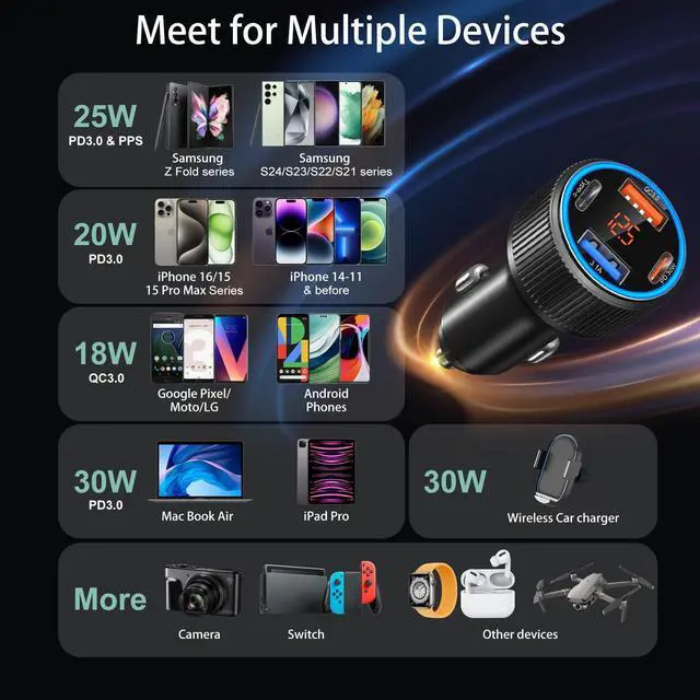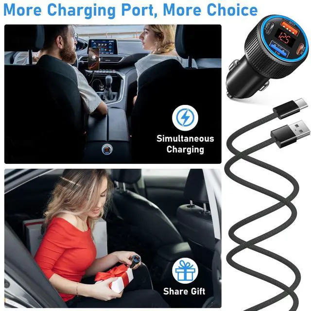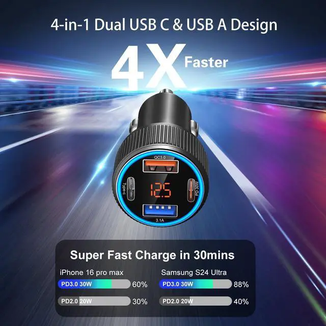 Upgraded 4-in-1 Car Phone Charger: Designed with dual 12V usb-c and usb-a car charging ports arranged on the edge of the car charger, you can easily plug the charging cords to power up your devices. It provide multiple charging protocol options and has connections for both standard usb and latest usb-c connectors.