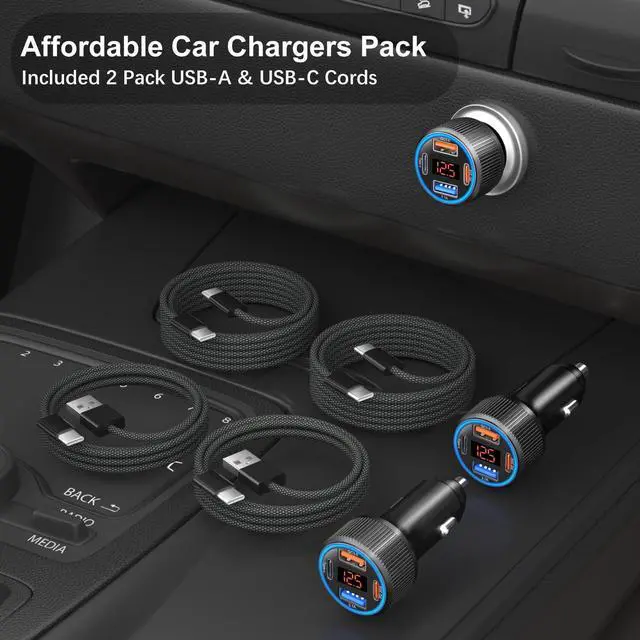 A Must Car Chargers Pack: Affordable 2 pack car charger with 4 pack usb-c cables, perfect for multi-car families with multiple devices charging needs. The included 4 pack usb-c cables are capable of 60W super charging for the high speed needed device, like iPhone 16 15 pro max series and Galaxy S25 S24 ultra devices. The 2 pack 3 feet usb-a to usb-c cable is suitable for using in the front sear while the 2 pack 6 feet usb-c to usb-c cable is perfect for using in the back for kids, riders or passengers.