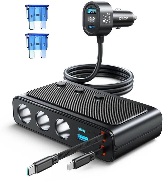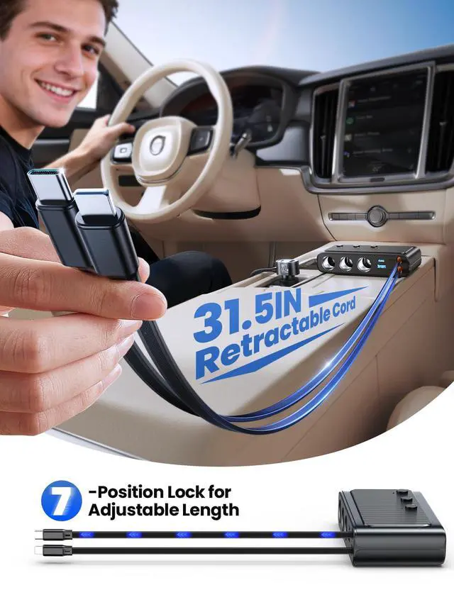 3.3ft extension cable + 31.5-inch retractable cords: Expands charging range to front/back seats and trunkideal for family trips/long drives, maximizing car port flexibility, Dual retractable Type-C+Lightning cables keep car interior tidyType-C supports 45W fast charging, Lightning 5V/2.4A, perfectly compatible with iPhones, Samsungs, tablets, and other devices