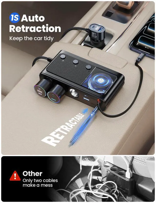 Wide compatibility: Compatible with 12-24V vehicles (SUVs, trucks, MPVs, RVs, off-road vehicles, etc.), the USB ports work with FM transmitters, phones, tablets, and GPS, while the cigarette lighter sockets fit air purifiers, car vacuums, inflators, and heated seats.