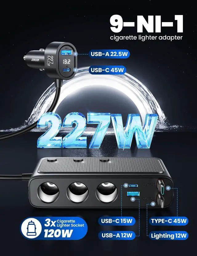 227W 9-in-1 car cigarette lighter adapter: 6 charging ports + 3 cigarette lighter sockets, fits 12V/24V vehicles, charges 9 devices at once (GPS, dash cams, car fridges, etc.). Included Velcro for stable fixation. (No electrical device connection when vehicle is off for long avoid battery drain.)