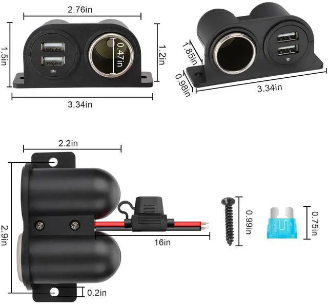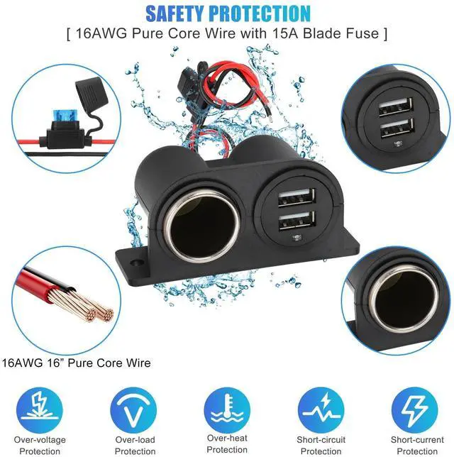 The 12v socket power outlet is come with a standard 15A in-line fuse, protect your device from over-voltage, over-heating, over-load, or short-circuit. Wire Gauge: 16 AWG, Length: 16 inches, Material: pure copper wire, good electrical conductivity, low resistance, easy to install, connect the RED wire to ''+'' and BLACK wire to "-".