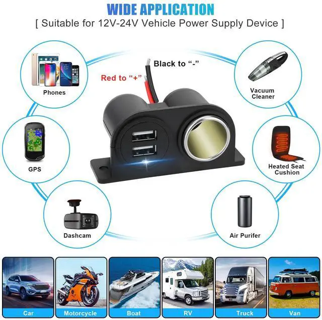 The 12v auxiliary power outlet is equipped with a female socket, which can power 12-24V vehicle equipment, such as car tire inflator, fridge, power inverter, vacuum, coffee maker, refrigerator, tire pumps, air compressor, cooler, vacuum cleaner, seat heater, and other car appliances in your vehicle.