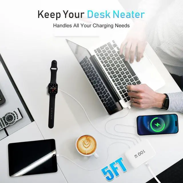 100W Fast Charging HubUSB C Charger Block with 1x USB-C PD 25W port + 2x USB-C PD 20W ports + 3x QC 3.0 USB-A 12W ports deliver 100W total power charge 6 devices simultaneously at max speed. Includes a 5ft cord for flexible placement. 6 in 1 USB-C Charging Station Charges iPhone 14 to 50% in 30 mins, perfect for phones, tablets, wireless earbuds, and power banks.