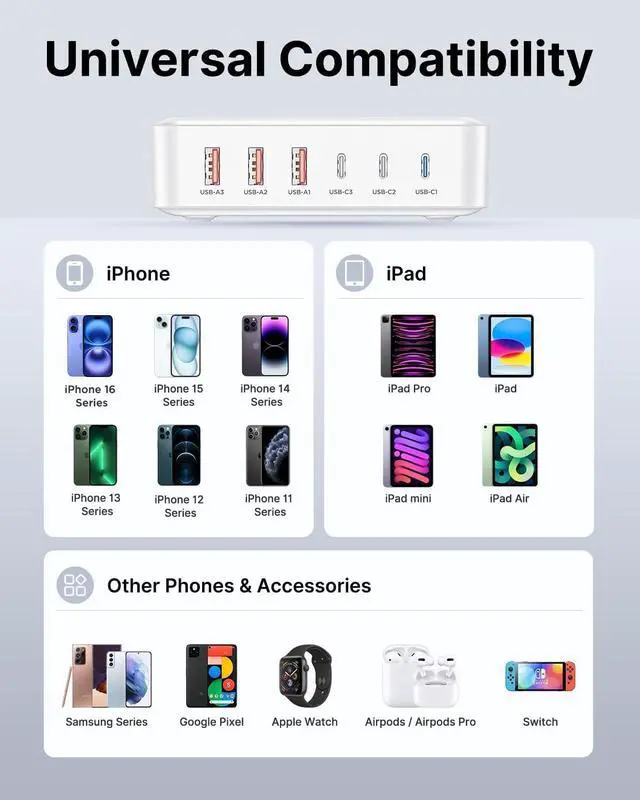 Universal CompatibilityMultiport USB block are compatible with iPhone 17/17 Air/17 Pro/17 Pro Max/iPhone 16/16 Pro/16 Pro Max/16 Plus, iPhone 15/15 Pro/15 Pro Max/15 Plus, iPhone 14/14 Pro/14 Pro Max/14 Plus, iPhone 13/13 Pro/13 Pro Max/13 Mini, iPhone 12/12 Pro/12 Pro Max/12 Mini, iPhone 11/11 Pro/11 Pro Max/XS/XS Max/XR/X/8 Plus/8/7, iPad Pro/iPad Air/iPad Mini, Samsung Galaxy S24 Ultra/S24+/S24/S23 Ultra/S22 Ultra Series, Google Pixel 6/5/4a, Mag-safe Wireless Charger, and more.