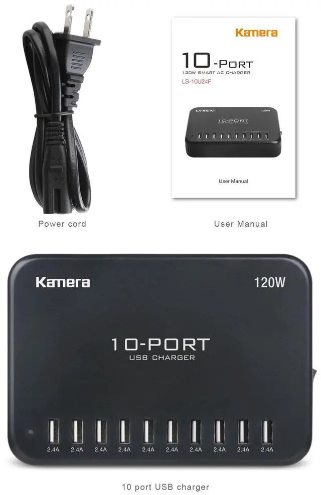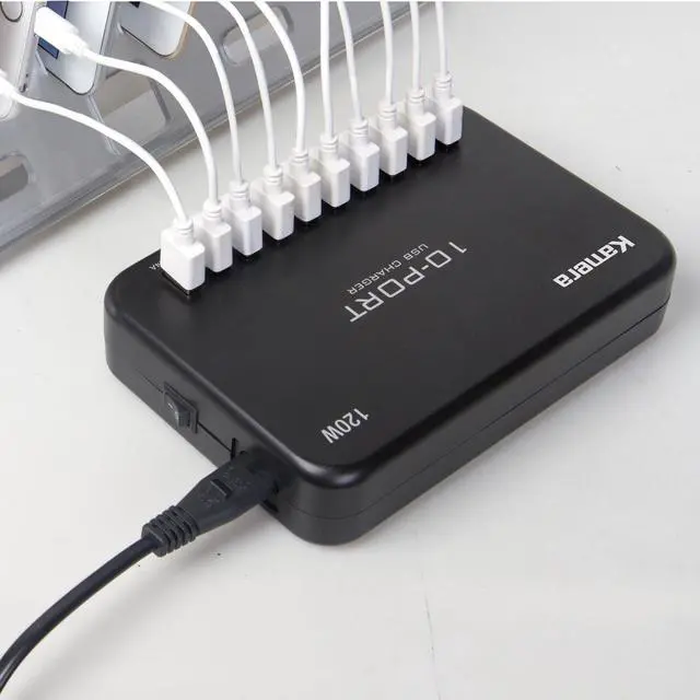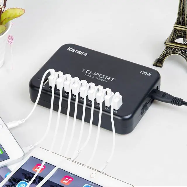 120 Watt 10 ports USB Charger, your ultimate choice for a heavy duty USB Hub Charging Station. It works for iPhone 7 / 6s / Plus, iPad Pro / Air 2 / mini, Galaxy S7 / S6 / Edge / Plus, Note 5 / 4 and More. Enabling simultaneous 10 devices charging….