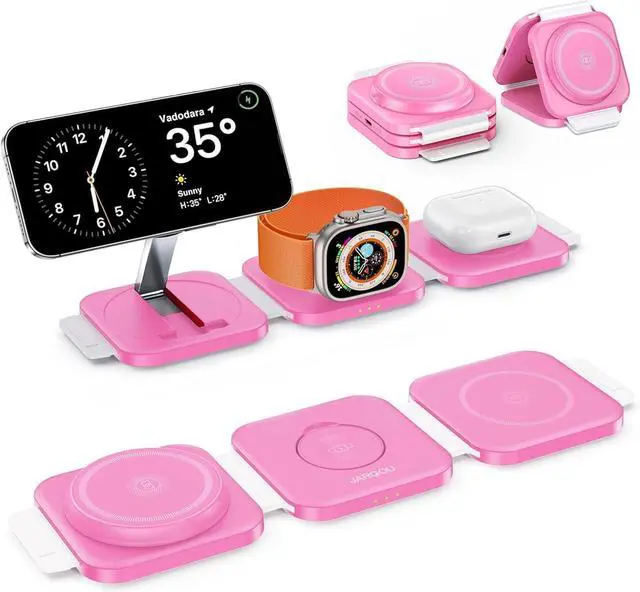 3 in 1 Magnetic Wireless Charger, Fast Charging Station for iPhone 17/16/15/14/13/12 Series, Travel Charger for Multiple Devices for AirPods 4/3/2/Pro, Charging Stand for Apple Watch Series (Pink)