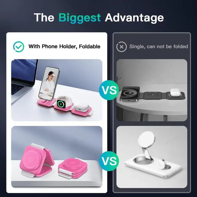 Else: This is the only wireless charging station on the market that has a stand and is foldable for travel! Let me introduce to you the two feature of wireless charging station: the first is that our 3 in 1 wireless charging station stand has more functional designs at the same price, the second is the self-developed wireless charging station