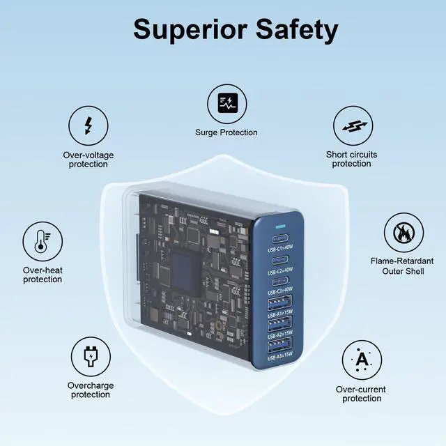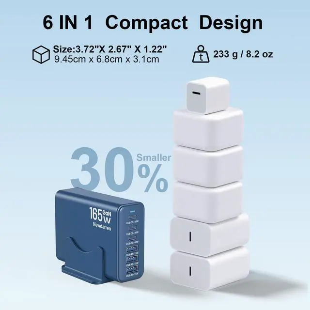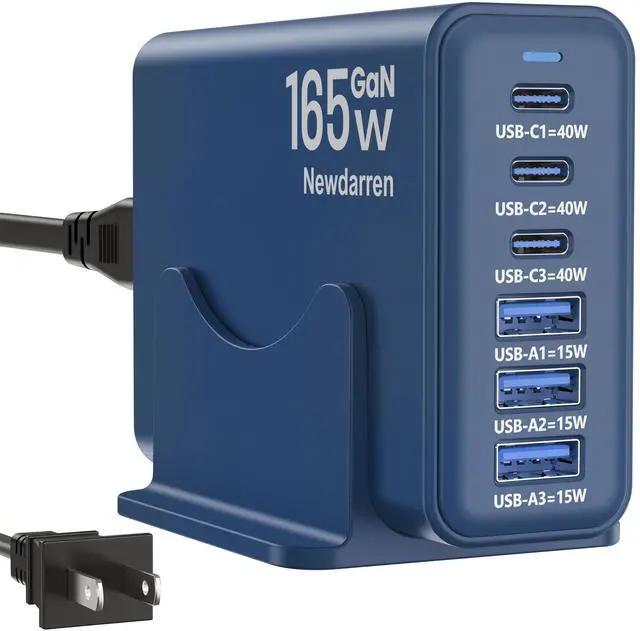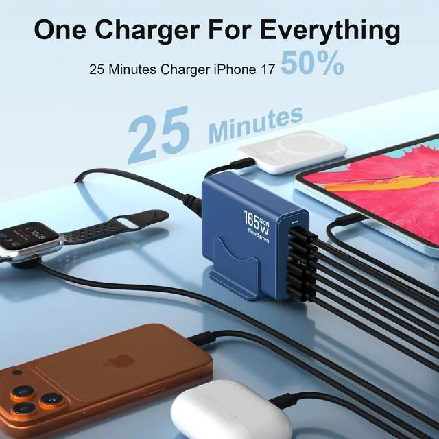 Ultra-Fast Desktop Charging StationGet Your iPhone 17 To 50% In Just 25 Minutes. This 6-In-1 Charging Hub Features 3 Usb-C Ports (40w Max Each) and 3 USB-A Ports (15w Max Each), With A Combined Output of Up To 165W. Charge Six Devices SimultaneouslyLike Your Smart Watch, Earbuds, hand Fan, Power Bank and MoreWith No Waiting.